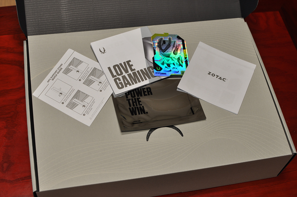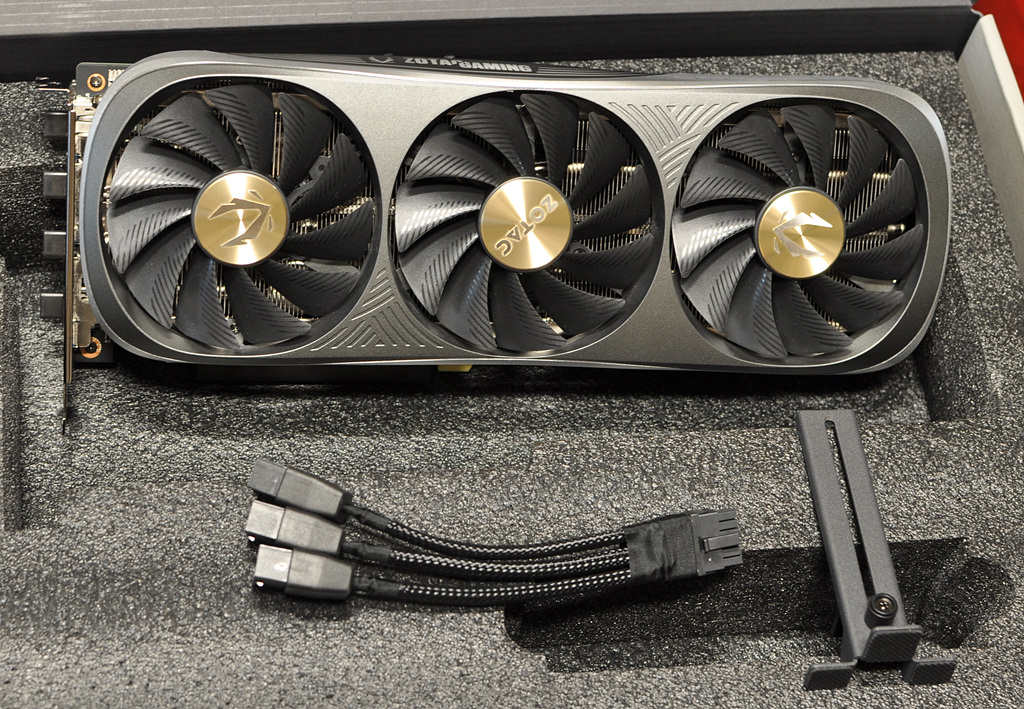 박스 내부에는 그래픽 카드와 전원 젠더, 지지대가 들어 있습니다. 4000 시리즈에서 선보인 조텍의 유선형 디자인은 은근한 멋스러움을 보여줍니다. 지지대 기본적으로 내장되어 있는 것도 좋습니다. 다만 지지대 높이가 좀 낮은 편이라 케이스 구조에 따라서는 사용이 불가할 수도 있겠습니다.