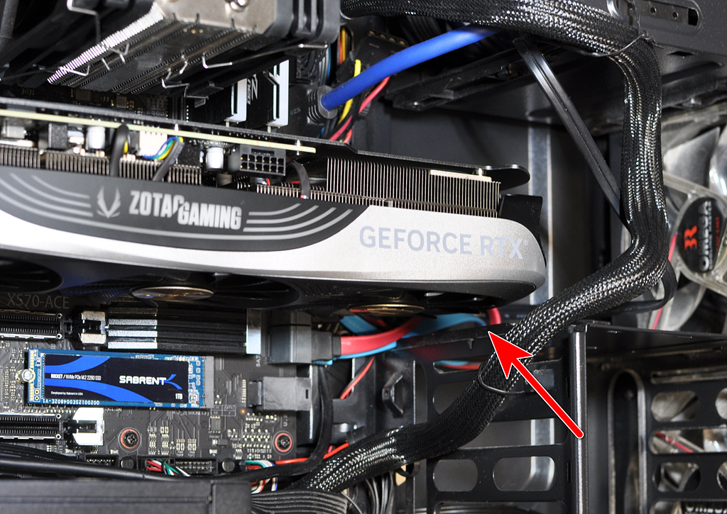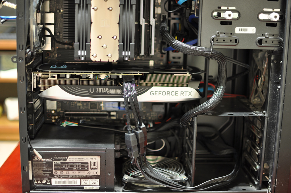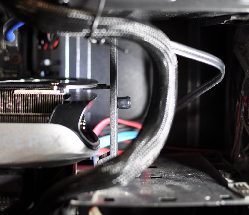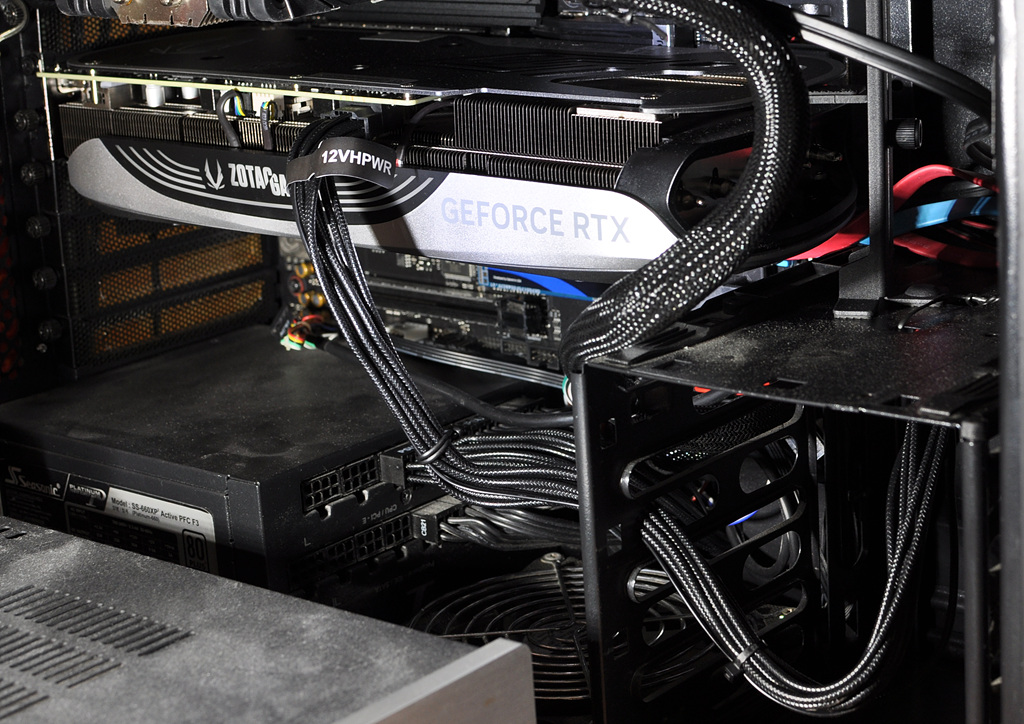 여담이지만 조립을 마치고 바라보니 PCI-e 5.0 젠더는 영 맘에 들지 않네요. 자그마한 커넥터 하나로 두꺼운 케이블 세 개를 지지하는 식이라 케이블을 건드리면 연결부위에서 소음이 조금씩 나는데 뭔가 너무 무리하게 버티는 느낌이랄까요? 3가닥도 저럴진대 4080이나 4090처럼 4가닥 연결하면 더 부담이 클 듯합니다.