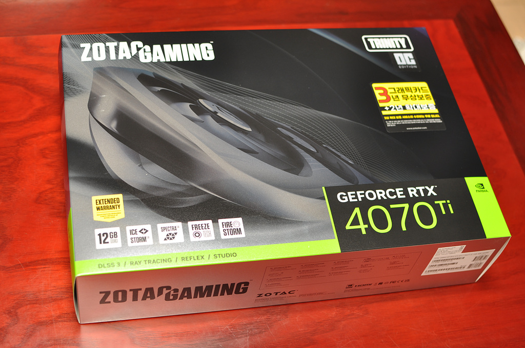 오늘의 주인공 ZOTAC GAMING GeForce RTX 4070 Ti Trinity입니다. 경합했던 구매 후보군에는 Inno3D와 MSI 벤투스 두 제품이 더 있었는데 모두 두께가 6cm 이내어야 한다는 조건으로 선택했습니다. 그래픽 카드 사려고 케이스까지 바꾸기는 부담스럽기도 하고 너무 덩치 큰 제품은 선호하지 않다 보니 가급적 작은 모델들로 범위를 좁혔죠. 솔직히 4070 ti에 3 슬롯 이상은 너무 오버라고 생각합니다.