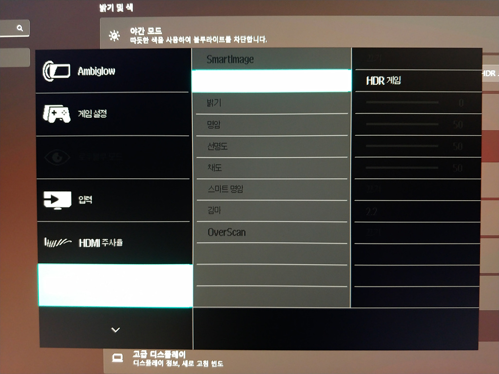 HDR 기능 덕분에 게임이나 고화질 영상들을 즐길 때 좋을 듯한데 사용자 지정 모드가 아니면 밝기/명암 등의 조정이 불가능해서 아쉽더군요. 단점이라고 할 정도는 아니고 제 기준에서 조금 불편한 정도입니다.
