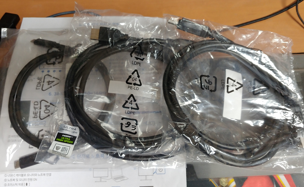 동봉된 케이블은 DisplayPort, HDMI, USB-C 3개였습니다. HDMI 케이블의 경우 Ultra High Speed 인증 케이블이 들어 있어서 신뢰가 더 갔습니다. 다만 USB 허브 기능을 사용하기 위한 USB 케이블이 추가로 들어 있지 않은 것은 좀 의외였습니다. USB 허브 기능을 기본적으로 사용하게 될 가능성이 높은데 말이죠.