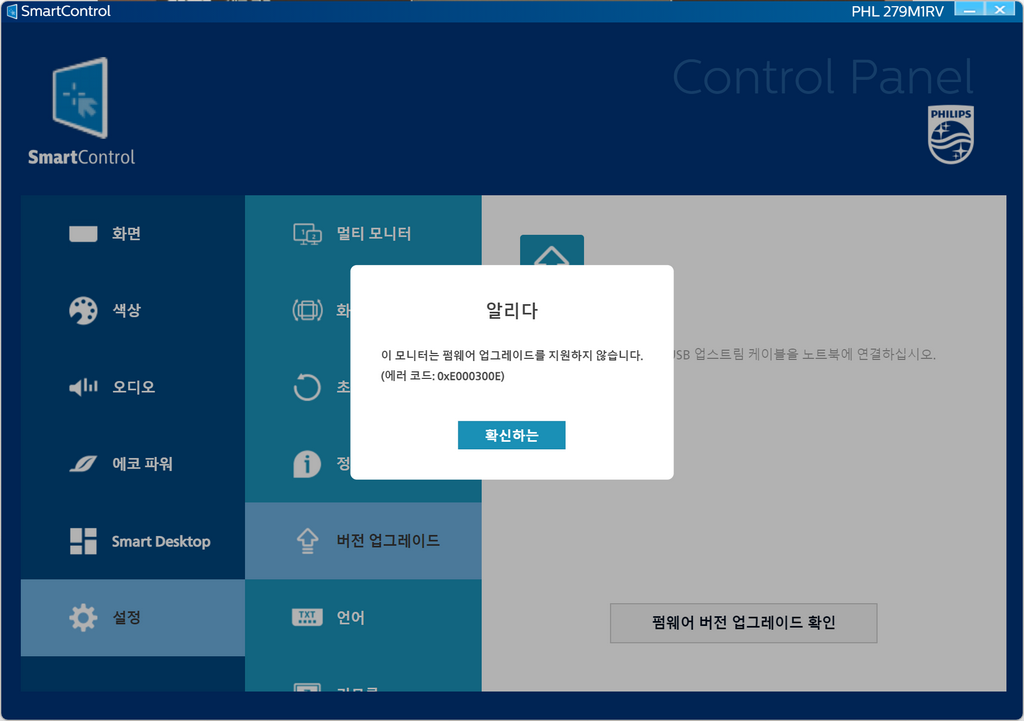 소소한 단점이나 버그로 보이는 증상들은 펌웨어 업그레이드로 수정이 되지 않을까 기대를 했었으나 SmartControl 프로그램으로 조회해 보니 업그레이드를 지원하지 않는다고 나오네요. ㅠㅠ 다만 모니터 설정을 프로그램으로 할 수 있으니 아주 편리했습니다.