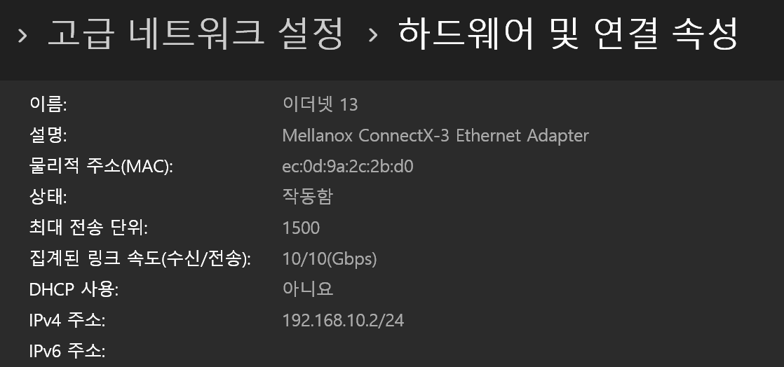 하드웨어 및 연결 속성 창을 보면 정상적으로 10G 연결이 된 것을 확인할 수 있습니다. 그런데 Ping도 반응 없고 파일 공유도 되지 않았습니다. 혹시나 해서 펌웨어 업그레이드를 해보려 했으나 펌웨어 유틸리티를 돌려 보면 카드가 없다고만 나오고...