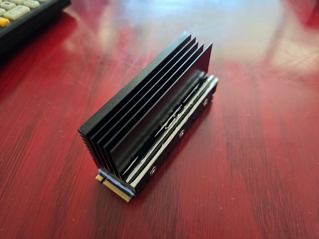 하단 SSD 위치가 PCIe 슬롯에 가까운데 SSD에 부착해 둔 방열판이 랜 카드의 방열판과 닿아서 설치가 불가능했습니다. ㅠㅠ (위 사진은 방열판 달기 전 상태) 방열판을 달지 않으면 SSD의 온도가 80~90도까지도 올라가기 때문에 고민 끝에 SSD 방열판 가공에 들어갑니다.